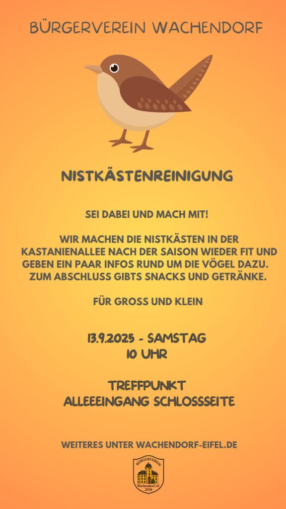 Auch dieses Jahr müssen unsere Nistkästen in der Kastanienallee gereinigt werden um sie fit zu machen für neue Besucher. Gerne könnt ihr uns dabei am 13.09. ab 10:00 Uhr unterstützen.